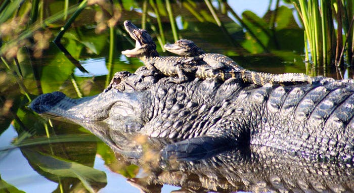 Alligator mothers will scout out a secluded section of bank and build a nest of mud, sticks and vegetation where they’ll lay between 20 and 50 eggs. The rotting “compost pile” she has created produces enough heat to keep the eggs warm. Once they’re born, momma will carry the babies to the water in her jaws for protection against testy males and other predators. When all is clear, she’ll tenderly open her maw and let the young take to the water. When no threats are present, she may also carry the babies on her back or head.