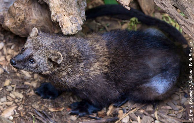 A relative of mink, otter and wolverine, fishers (Pekania pennanti) sport the thick soft fur, narrow bodies, sharp noses, and long bushy tails of the weasel family. These rare and agile forest carnivores are found only in North America. They rely heavily on hollow trees and logs, and large, connected expanses of mature trees to make their living.
