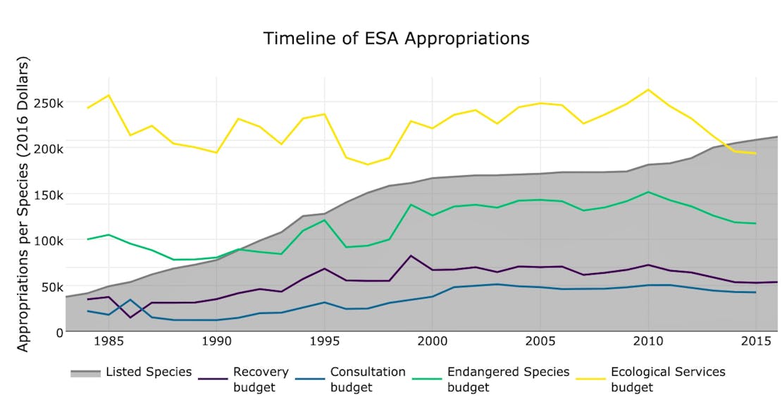 But, the burden of monitoring each species has become more and more costly, especially in recent years. As the number of threatened species has increased, the amount of federal resources allocated for the maintenance of the Endangered Species Act has stagnated (see Figure 1).