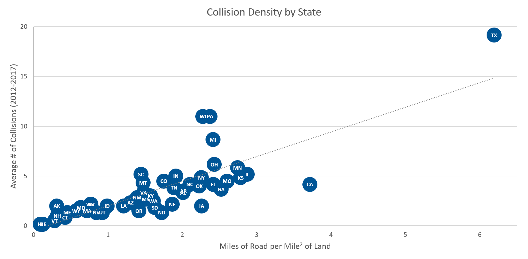 Roads are the reason why cars end up in the middle of wildlife habitat, so it’s no surprise that there are more reported collisions in states where there are more roads. By far, the highest number of human fatalities reported from wildlife-vehicle collisions and the highest density of roads are in Texas. The lowest is in Hawaii. There are over 4 million miles of public road in the contiguous U.S. As this number continues to rise, so does the number of fatal collisions.