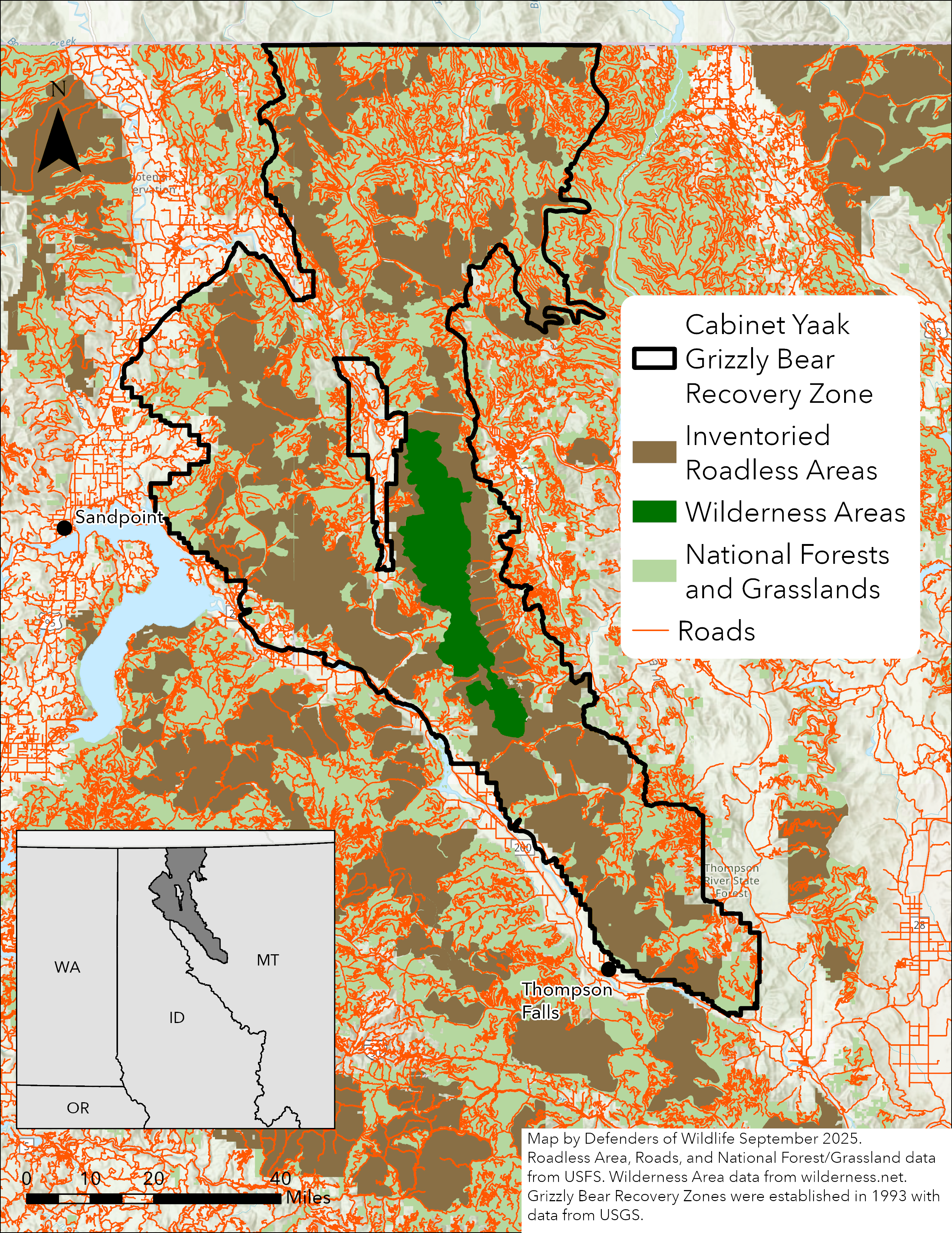 For example, within the Cabinet-Yaak ecosystem, which supports a small population of about 67 grizzly bears spread across northwest Montana and northeast Idaho. Almost 40% of Cabinet-Yaak grizzly bears’ habitat is in roadless areas, and the loss of conservation protections would be devastating for a population that already faces connectivity challenges and has not yet reached recovery goals.
