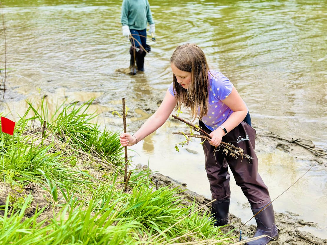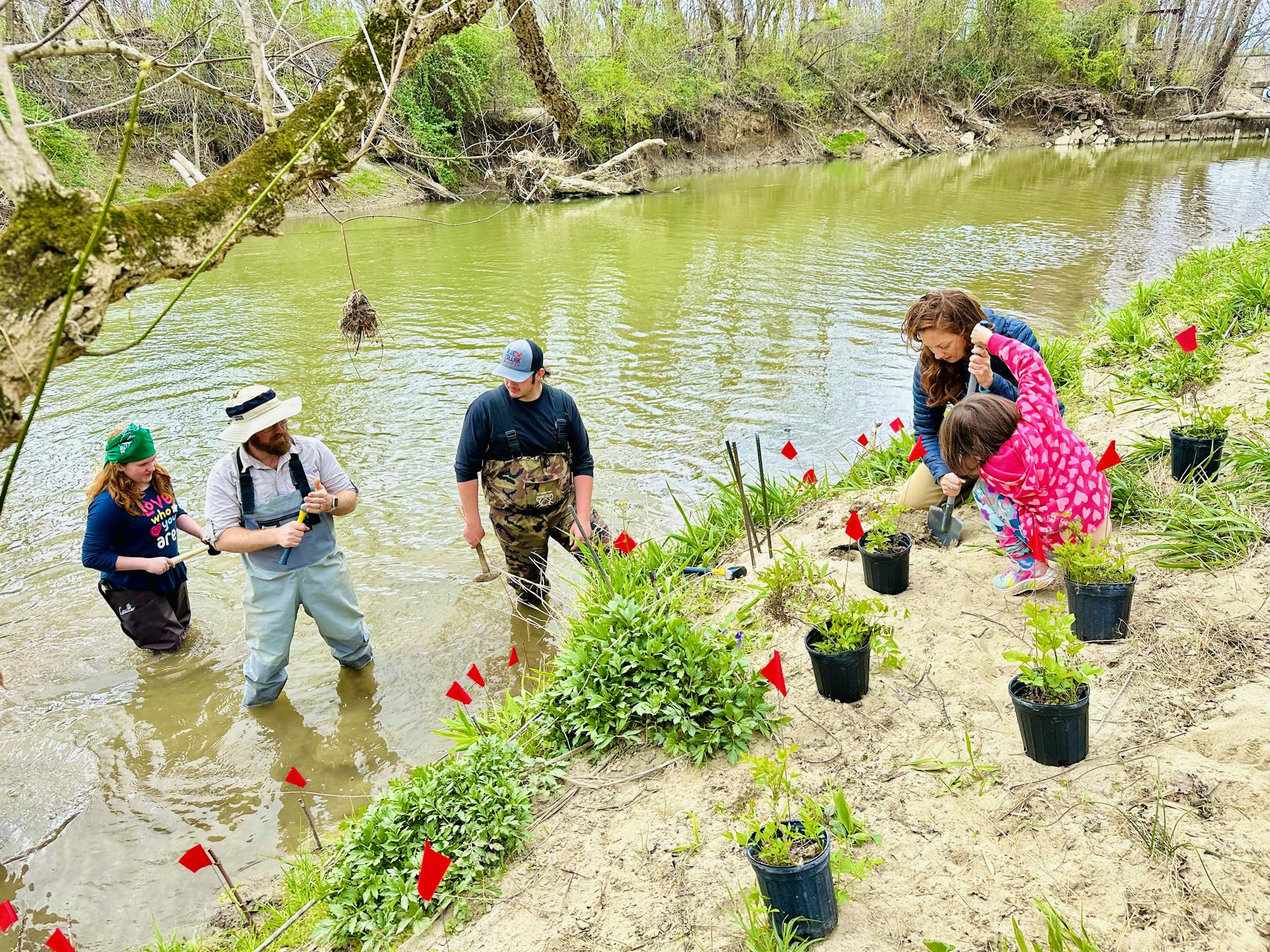 Planting sapling trees along the edge of the creek to stabilize the banks and keep waters cool, clean and teeming with wildlife