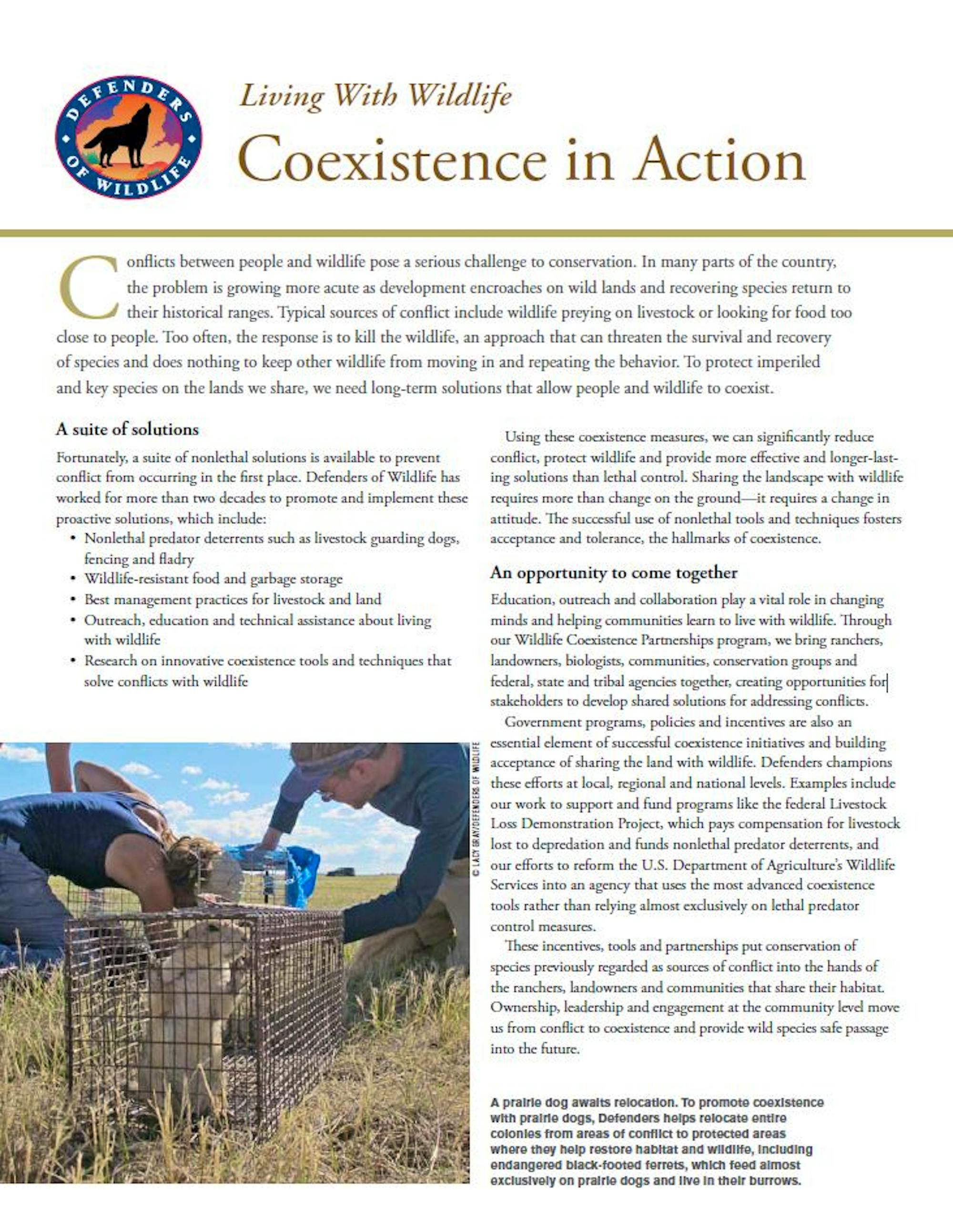 Conflicts between people and wildlife pose a serious challenge to conservation. Too often, the response to a conflict is to kill the wildlife, an approach that can threaten the survival and recovery of species and does nothing to keep other wildlife from moving in and repeating the behavior. To protect imperiled and key species on the lands we share, we use long-term solutions that allow people and wildlife to coexist. Download the factsheet for examples of these methods in action across the country.