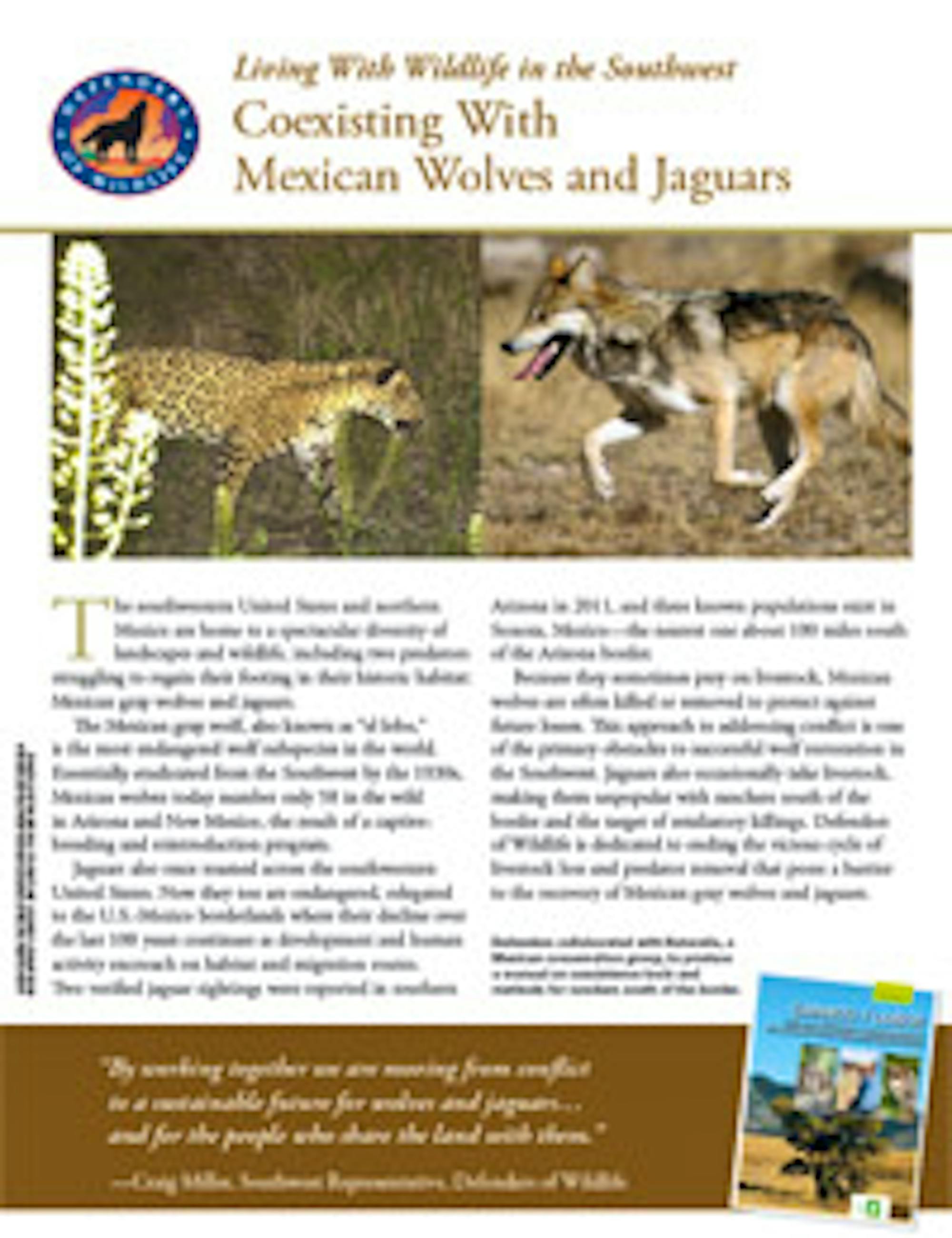 The southwestern United States are home to two predators struggling to regain their footing in their historic habitat: Jaguars and Mexican gray wolves. Defenders of Wildlife is dedicated to ending the vicious cycle of livestock loss and predator removal that poses a barrier to the recovery of these animals.