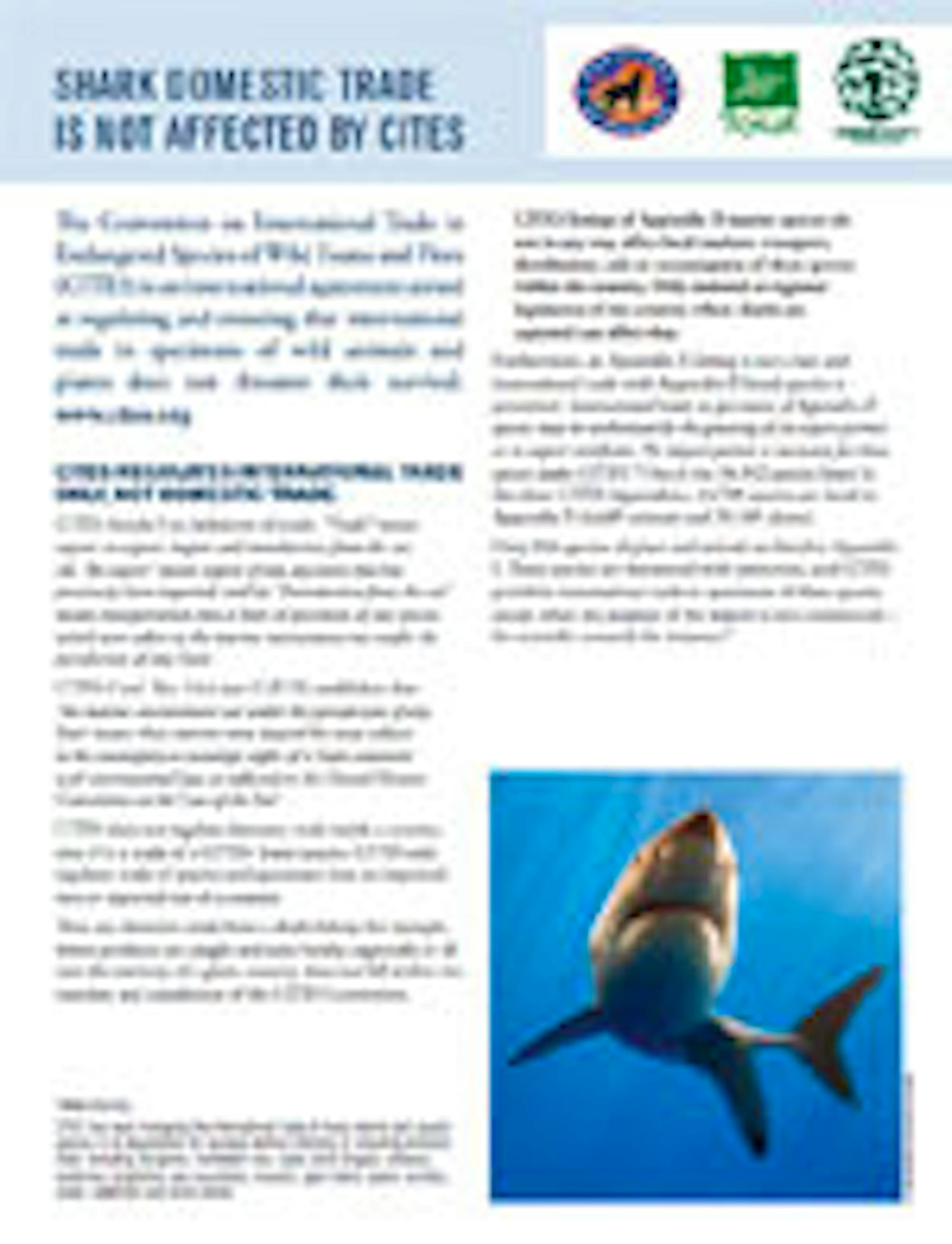 The Convention on International Trade in Endangered Species of Wild Fauna and Flora (CITES) is an international agreement aimed at regulating and ensuring that international trade in specimens of wild animals and plants does not threaten their survival. This factsheet explains how the protections for sharks under CITES do not apply to domestic trade, and combats the misinformation surrounding the impacts of a CITES listing for sharks.